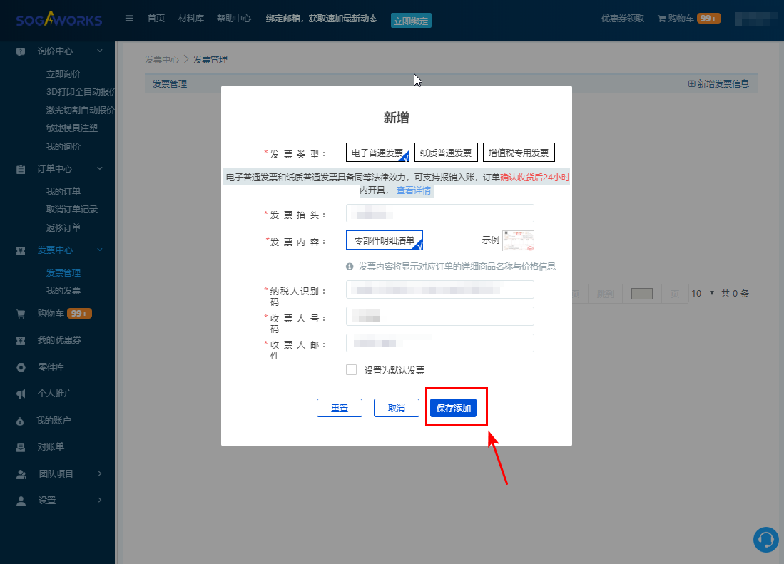 4. 點擊【保存添加】,則新的開票信息新增完成