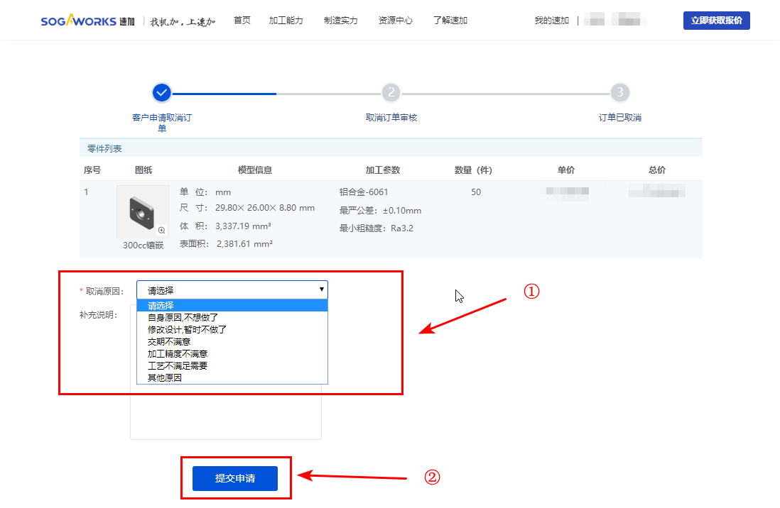 6. 按提示完善信息后,點(diǎn)擊【提交申請】,訂單取消申請成功