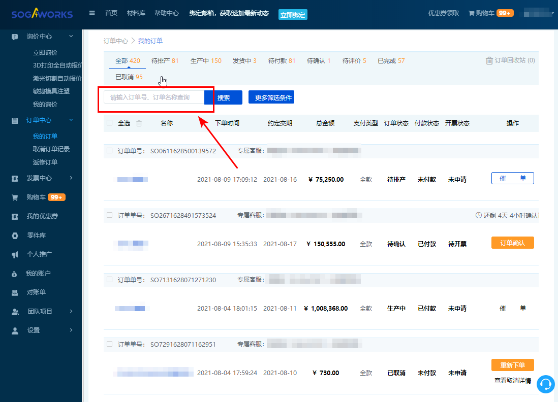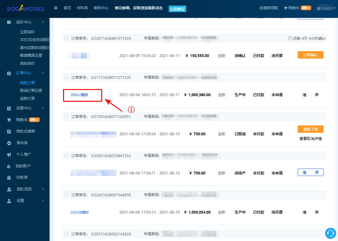 3. 點(diǎn)擊需查詢生產(chǎn)狀態(tài)的零件訂單編號,找到需查詢的訂單